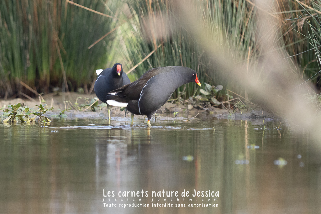Comportement : La Gallinule poule-d’eau est souvent cachée, mais s’observe aussi à découvert dans les herbes au bord de l’eau. Quand elle marche, elle redresse la queue et la hoche fortement. Elle hoche la tête en nageant, et utilise ses longs doigts pour marcher sur la végétation flottante et dans la boue. Lors de la parade nuptiale, le mâle offre des tiges de plantes aquatiques à la femelle. Il déploie aussi la queue pour exposer ses sous-caudales blanches.